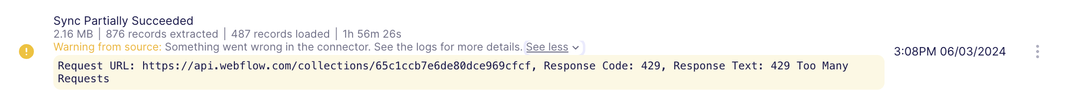 Sync errors can also be shown in yellow. These can range from transient errors to warnings from the source (e.g. rate limits). These types of errors usually resolve themselves without any action required.